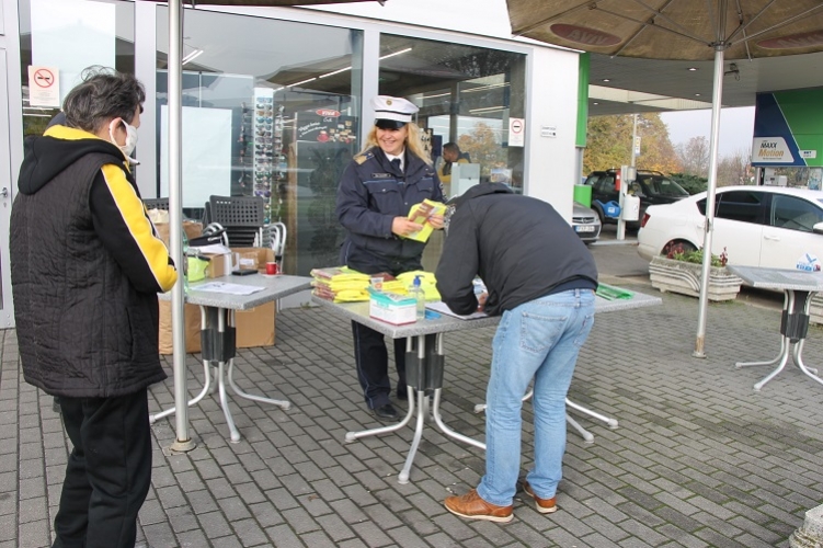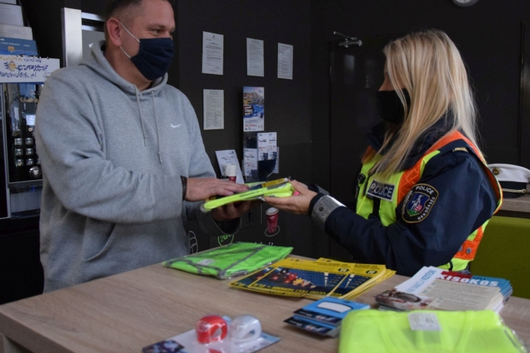 Nagy volt az érdeklődés a tatabányai OMV üzemanyagtöltő állomáson, ahol a rendőrök láthatósági eszközöket osztottak.