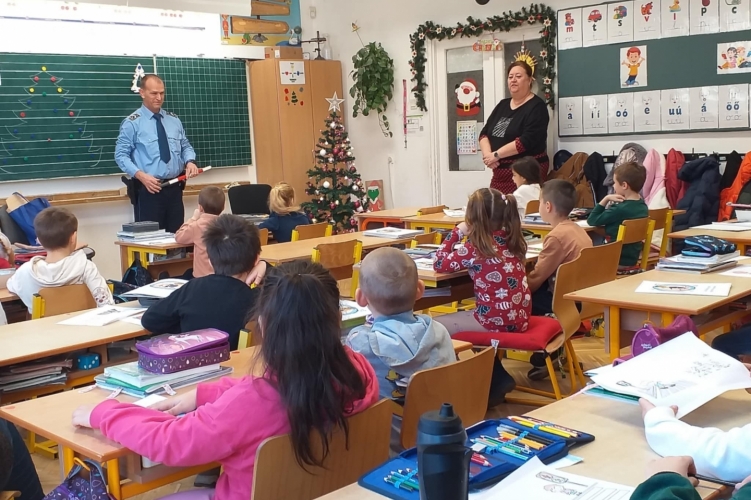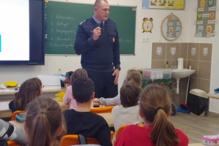 A tolnai iskolarendőr az egyik helyi „KEVE” iskola kisdiákjainak tanította meg a rendőri karjelzéseket.