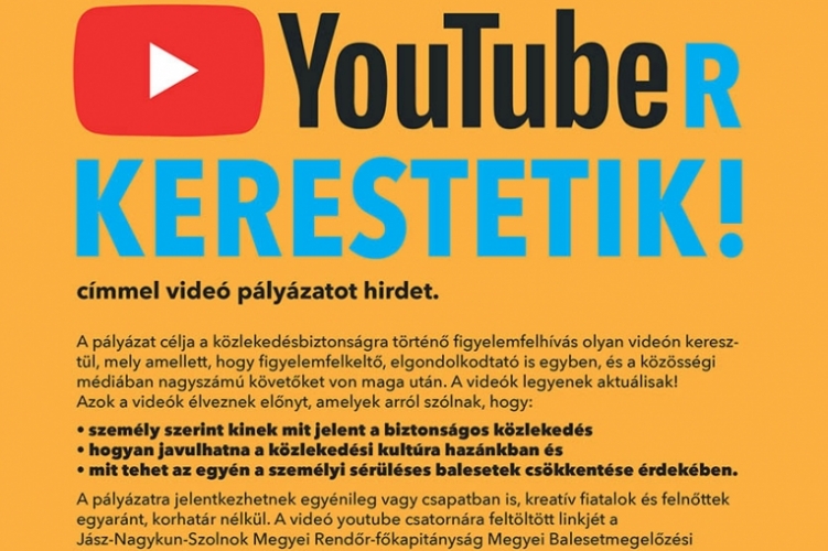 A Jász-Nagykun-Szolnok Megyei Rendőr-főkapitányság Balesetmegelőzési Bizottsága közlekedésbiztonsági videópályázatot hirdet.