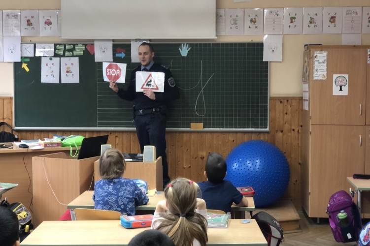 A Sümegi Rendőrőrs munkatársa a helyi általános iskolában tartott baleset-megelőzési foglalkozást.