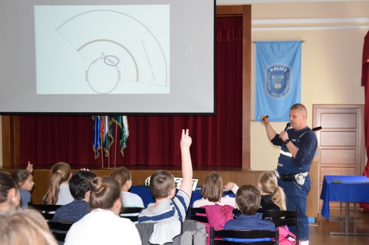 A biztonságos közlekedésről tartott interaktív előadást a Veszprémi Rendőrkapitányság munkatársa egy általános iskola diákjainak.