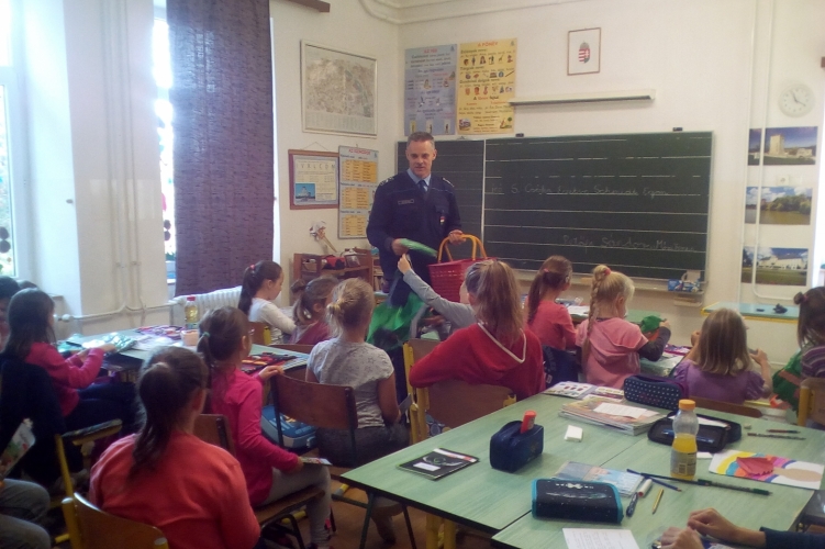 A Tapolcai Rendőrkapitányság munkatársa a helyi általános iskolában tartott baleset-megelőzési foglalkozást.