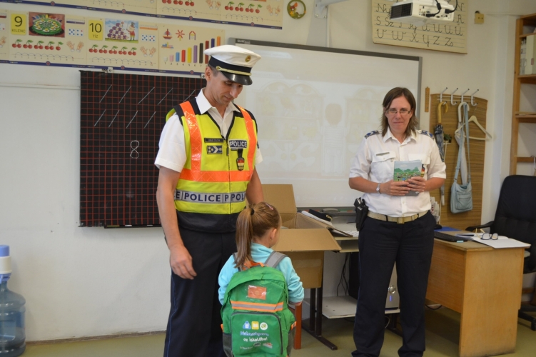 Az iskolarendőr füzet, táska és egyéb jelképes ajándék átadásával igyekszik emlékezetessé tenni az iskolakezdést.