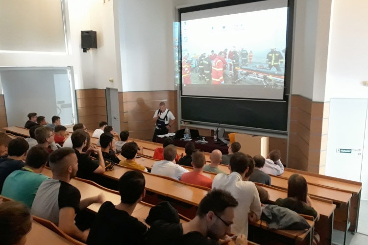 Pintér József, a Veszprémi Rendőrkapitányság balesethelyszínelője egyetemi hallgatóknak tartott előadást a biztonságos közlekedésről.