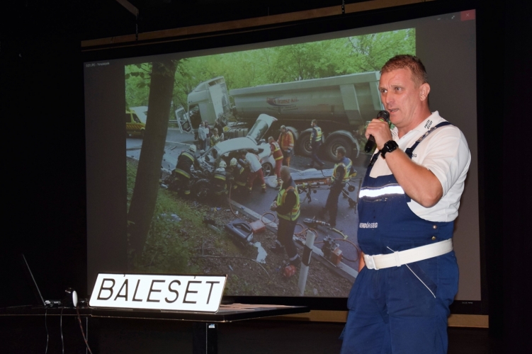 A Veszprémi Rendőrkapitányság baleseti helyszínelője a Hangvilla színháztermében és a város polgármesteri hivatalában tartott rendhagyó előadást a biztonságos közlekedésről.