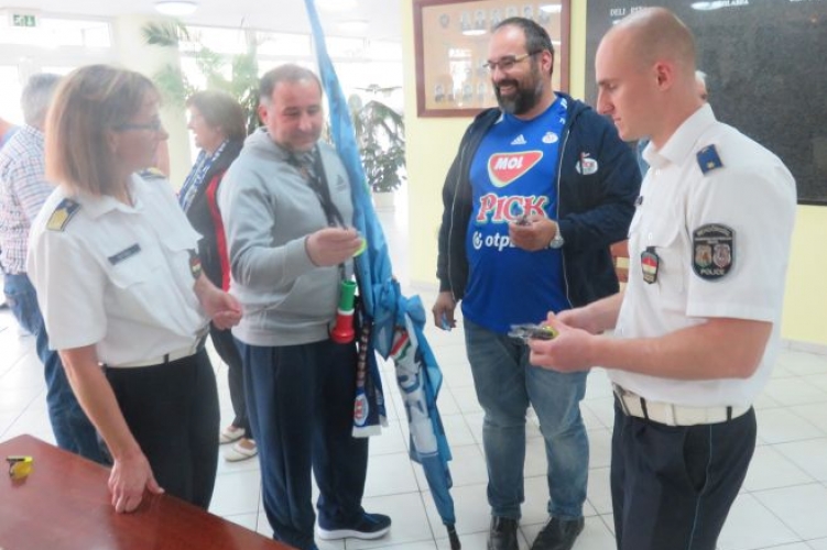 A tatabányai kézilabda mérkőzés előtt a szurkolók ajándékokat kaptak a rendőröktől.