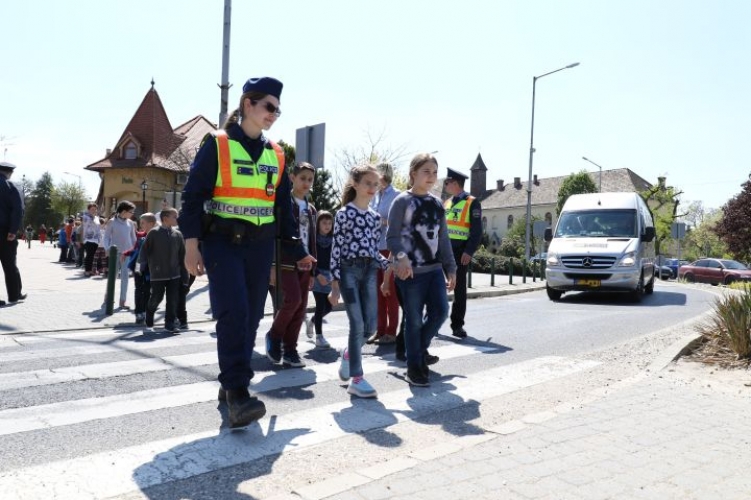 A rendőrök a tatai Vaszary János Általános Iskolában hívták fel az alsó osztályos tanulók figyelmét a szabálykövető közlekedésre.