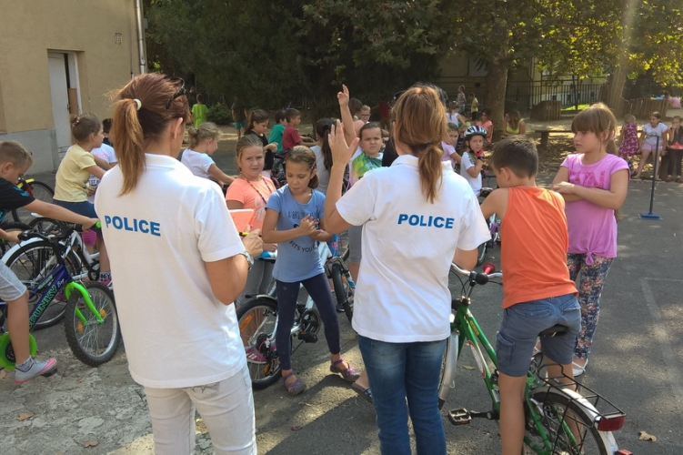 Kerékpáros kisgyermekek várták az iskolarendőrt Szolnokon.