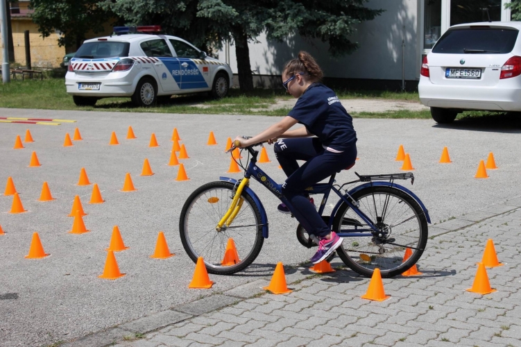 A Veszprém Megyei Rendőr-főkapitányság udvarán felállított kerékpáros ügyességi pályán gyakorolták a közlekedést a gyerekek.
