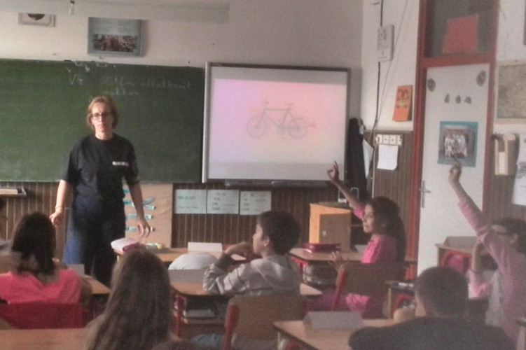 A Veszprémi Rendőrkapitányság munkatársa felhívta a gyerekek figyelmét a kerékpáros fejvédő sisak viselésének fontosságára és a láthatósági mellény használatának szabályaira.