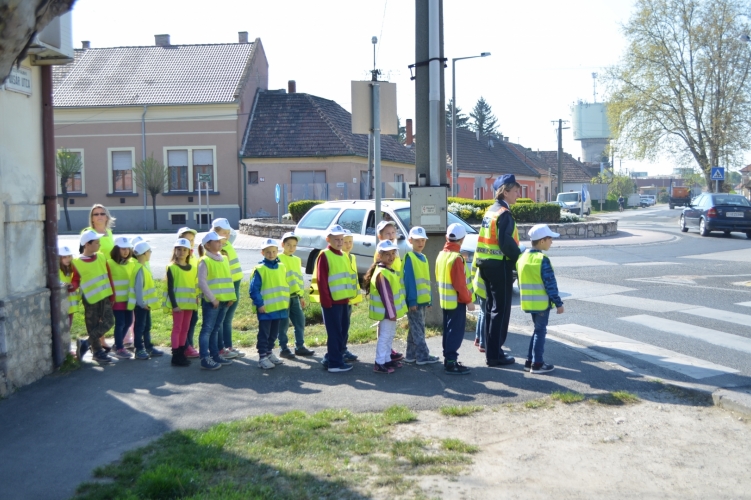 Az úttesten történő szabályos átkelést gyakorolták iskolarendőrükkel az egyik pápai általános iskola elsősei.