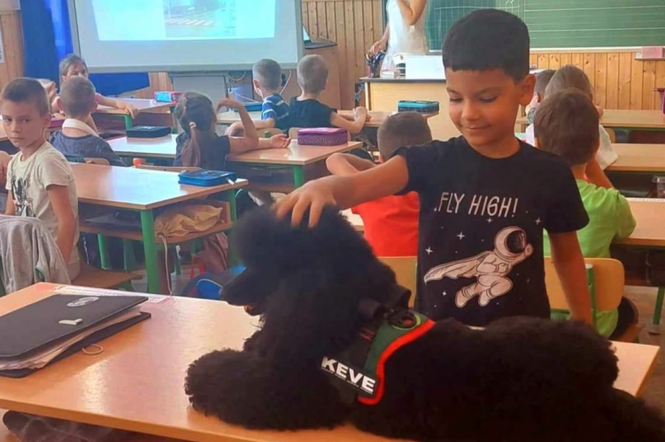 Keve, a terápiás kutyus is részt vett a balesetmegelőzési program első óráján a szolnoki általános iskolában.