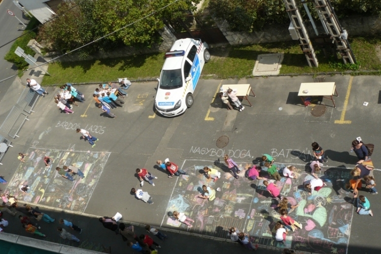 Gyerekzsivajtól volt hangos a Tapolcai Rendőrkapitányság melletti kis utca 2014. szeptember 19-én 13 órától, ahol az Európai Mobilitási Hét alkalmából közlekedésbiztonsági aszfaltrajzversenyt hirdettek a város első osztályos diákjai számára.