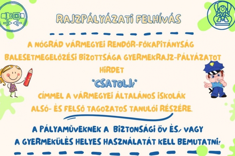 A Nógrád Vármegyei Rendőr-főkapitányság Balesetmegelőzési Bizottsága rajzpályázatot hirdet a vármegye általános iskolás tanulói részére.