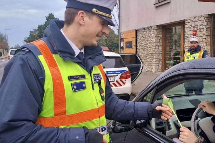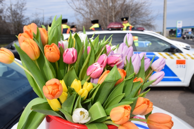 A szabályosan közlekedő hölgyeket egy-egy szál virággal köszöntötték a helyi rendőrök.
