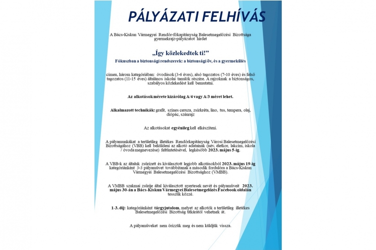 A Bács-Kiskun Vármegyei Rendőr-főkapitányság Balesetmegelőzési Bizottsága gyermekrajzpályázatot hirdet.
