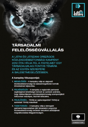 Közlekedésbiztonsági kampányt indított az Országos Baleset-megelőzési Bizottság és az X-MEDITOR Kft. A 2012 óta minden októberben és novemberben „Látni és látszani” címmel megrendezett akciót változatlan célokkal hirdették meg. A látás és a láthatóság fontosságára igyekeznek ráirányítani a figyelmet, hiszen a balesetek megelőzése szempontjából mindkettő rendkívül fontos. Az Európai Unió tagállamainak közös célja, hogy csökkenjen a személyi sérüléssel járó közúti közlekedési balesetek száma. Ezért a közlekedők tudnak tenni a legtöbbet azzal, hogy felmérik, milyen kockázatokkal és mekkora felelősséggel jár a közúti forgalomban való részvétel. Ha nem tartják be a szabályokat, magukat, utasaikat és közlekedő partnereiket is veszélyeztetik.