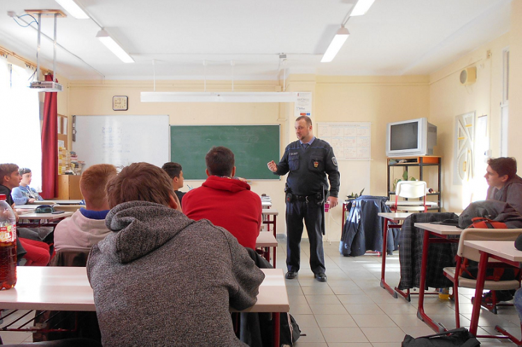 A várpalotai Faller Jenő Szakképző Iskola és Kollégium 9. évfolyamos diákjainak tartott előadást a helyi rendőrkapitányság iskola rendőre.