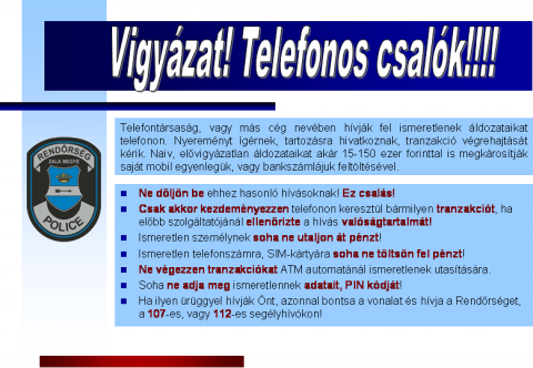 A mellékelt dokumentumokban a Zala Megyei Rendőr-főkapitányság Bűnmegelőzési Alosztályának aktuális hírlevele olvasható, amelynek lényege, hogy a rendőrség elektronikus levelezés (e-mail) útján juttatja el - az önkormányzatok és azok szakintézményei, valamint az állampolgárok - rendszerben regisztrált tagjai számára a mindig aktuális bűnmegelőzési információkat.