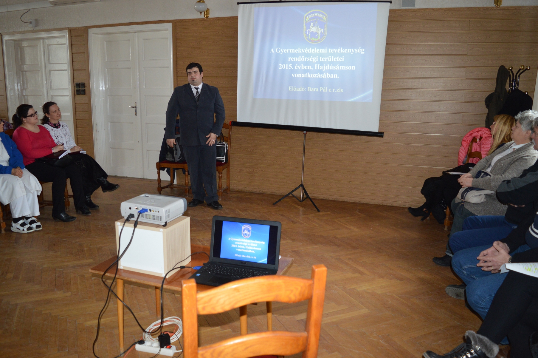 A Debreceni Rendőrkapitányság bűnmegelőzési előadója 2016. február 24-én részt vett Hajdúsámsonban a Család és Gyermekjóléti Szolgálat szakmai tanácskozásán, amelyen az előző évi működést és a jelzőrendszer hatékonyságát értékelték.