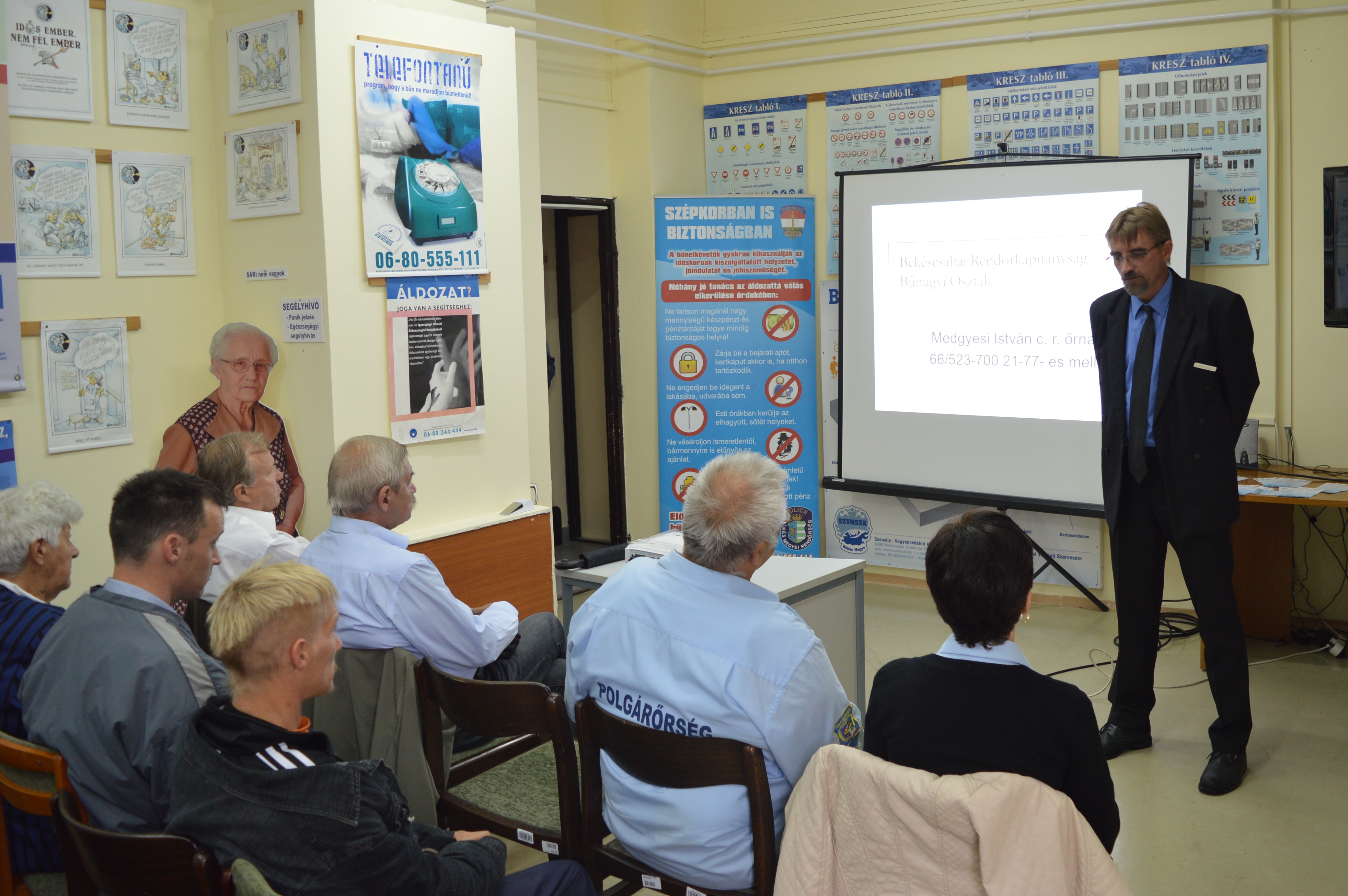 Október 1-je, az Idősek Világnapja alkalmából a Békés Megyei Rendőr-főkapitányság Bűnmegelőzési Osztálya és a Békéscsabai Rendőrkapitányság rendőrei időskorúak részére tartottak előadásokat Békéscsabán, a rendőrség Megelőzési és Tájékoztató Irodájában 2016. október 3-án. Mivel az idősek koruk és élethelyzetük miatt könnyen bűncselekmény vagy szabálysértés áldozatává válhatnak, ezért a rendőrség kiemelt feladatának tekinti a megelőzéssel kapcsolatos tájékoztatást. A szakemberek az idősek sérelmére elkövetett jogsértő cselekmények jellemzőiről, módszereiről, azok megelőzési lehetőségeiről beszéltek az érdeklődőknek. A tájékoztatón a megyéből több mint harmincan vettek részt, akik hallhatták azt is, hogy milyen vagyonvédelmi eszközök alkalmazásával élhetnek biztonságosabban, hogyan védhetik meg magukat a tisztességtelen szándékkal közeledőktől. Több lehetőség mellett megismerhették az elektromos ajtóéket, amely megakadályozza a bejutást és bemutatták a vezeték nélküli csengőt, amellyel egy közelben lakó szomszédnak jelezhetnek, ha bajba kerülnének. A résztvevők a program végén a legfontosabb tudnivalókat tartalmazó összefoglaló kiadványokat vehettek át.