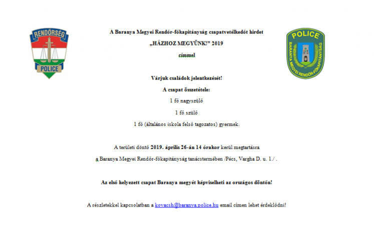 Baranya megyében is folytatódik a Házhoz megyünk vagyonvédelmi program, amelynek részeként a Bűnmegelőzési Osztály munkatársai vetélkedőt szerveznek. A vetélkedőre három fős családok (egy nagyszülő, egy szülő és egy 5-8. osztályos gyermek) jelentkezését várják. A Baranya Megyei Rendőr-főkapitányságon 2019. április 26-án 14 órakor rendezik meg a vetélkedőt, az ott legjobb eredményt elérő csapat jut tovább az országos megmérettetésre.