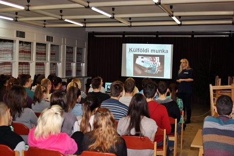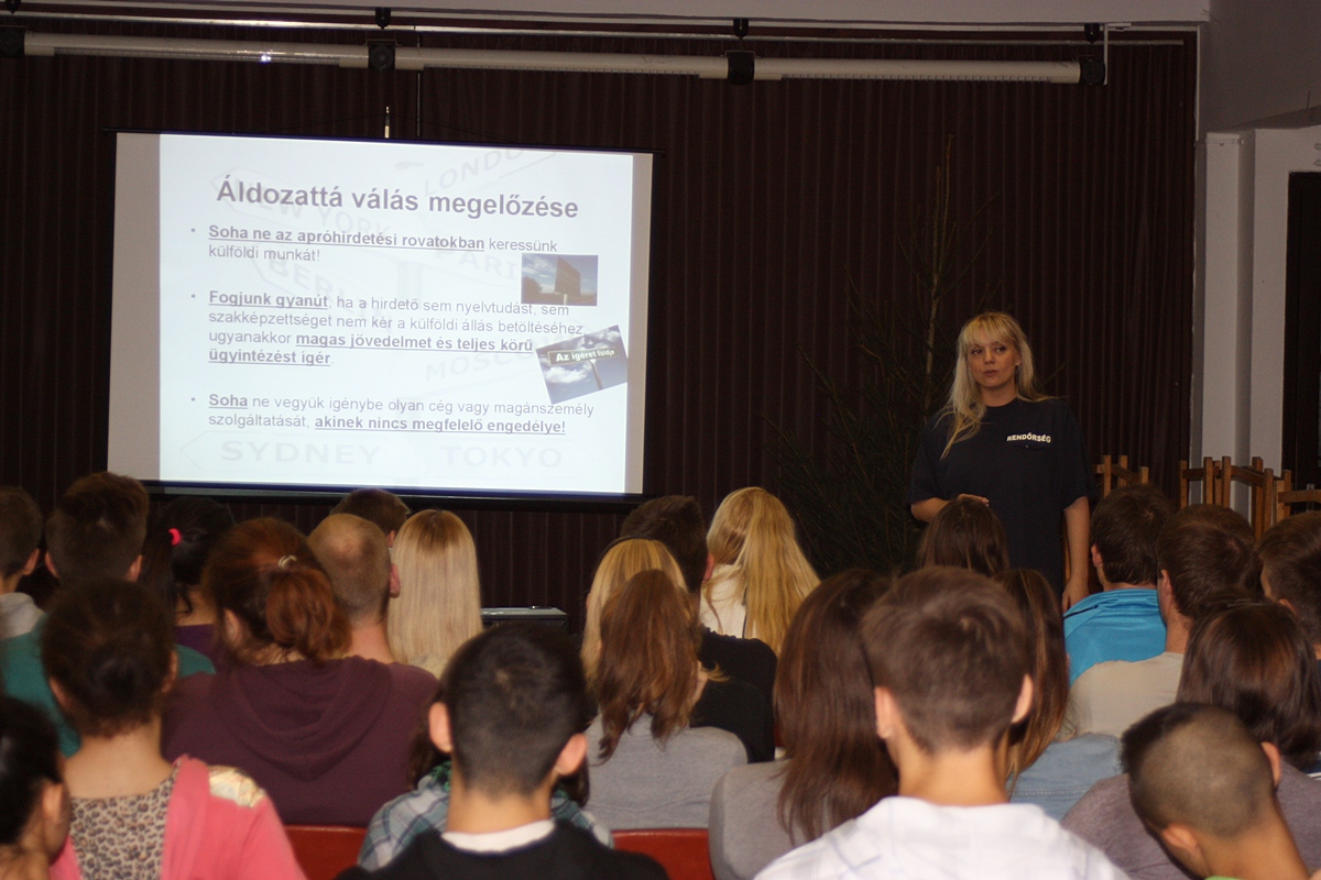 Az előadás második felében a szakiskolai hallgatók kérésére Bátori Szabina rendőr főhadnagy rövid tájékoztatót tartott a külföldi munkavállalás veszélyeiről.