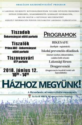 A rendőrség a másfél éve tartó „Házhoz megyünk!” elnevezésű országos kampánysorozatot idén is folytatja. A Szabolcs-Szatmár-Bereg Megyei Rendőr-főkapitányság Bűnmegelőzési Osztályának munkatársai a prevenciós programmal legközelebb 2018. június 12-én 10-14 óráig Tiszavasváriban az OTP parkolóban, Tiszalökön a Príma ABC előtti parkolóban és Tiszadobon az önkormányzat épülete előtt várják az érdeklődőket. A szakemberek a program keretében tájékoztatást és ajánlásokat adnak vagyonvédelemről, az internet veszélyeiről, az áldozatvédelemről és a családon belüli erőszakról. Az országos kampánysorozat fő célja, hogy szakemberektől származó információk közreadásával a rendőrség segítse a közbiztonság növelését és javítsa az állampolgárok önvédelmi képességét. A megjelenteknek a helyszínen lehetőségük nyílik a „BikeSafe” program keretén belül kerékpárjaik ingyenes regisztrációjára.