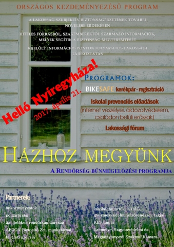 A korábbi évek pozitív eredményei alapján a 2017. évben is folyatódik a rendőrség „Házhoz megyünk!” bűnmegelőzési programja, amelynek célja, hogy szakemberektől származó információk közreadásával segítsük a biztonság növelését és javítsuk az állampolgárok önvédelmi képességét. A kezdeményezés a megelőző-vagyonvédelmi tanácsadás mellett kiegészült az áldozatvédelemmel, a családon belüli erőszakkal, az internetbiztonsággal, a drogprevencióval, és az iskolai bűnmegelőzéssel foglalkozó programokkal, valamint a „bikesafe” kerékpár-regisztrációval. A program partnereiként vagyonvédelmi cégek, valamint az Aegon Magyarország Általános Biztosító Zrt. is bekapcsolódott. A kampánnyal a Szabolcs-Szatmár-Bereg Megyei Rendőr-főkapitányság Bűnmegelőzési Osztálya szervezésében a „Helló Nyíregyháza” elnevezésű rendezvényen találkozhatnak 2017. április 21-én Nyíregyházán, a Kossuth téren.