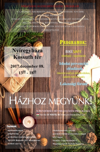 A Szabolcs-Szatmár-Bereg Megyei Rendőr-főkapitányság Bűnmegelőzési Osztályának munkatársai a „Házhoz megyünk!” prevenciós programmal 2017. december 8-án Nyíregyháza belvárosában várják az érdeklődőket. A szakemberek tájékoztatást és ajánlásokat adnak vagyonvédelemről, az internet veszélyeiről, az áldozatvédelemről és a családon belüli erőszakról. Az országos kampánysorozat fő célja, hogy szakemberektől származó információk közreadásával a rendőrség segítse a közbiztonság növelését és javítsa az állampolgárok önvédelmi képességét. A megjelenteknek lehetőségük nyílik a „BikeSafe” program keretén belül kerékpárjaik ingyenes regisztrációjára.