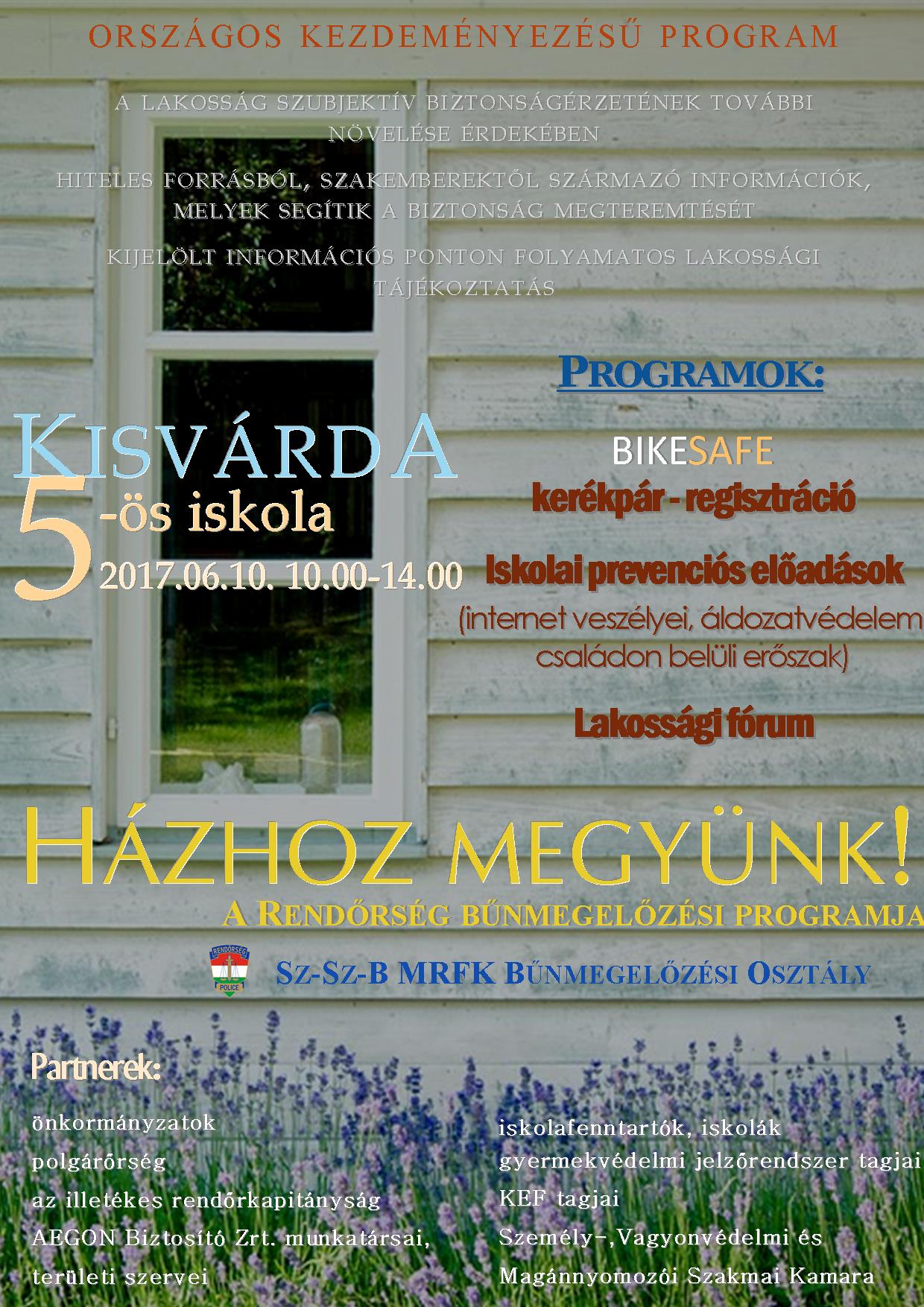 A „Házhoz megyünk” elnevezésű bűnmegelőzési programmal Szabolcs-Szatmár-Bereg megyében legközelebb 2017. június 10-én 10-14 óráig Kisvárdán, az 5-ös iskolában találkozhatnak az érdeklődők. Az országos kampánysorozat fő célja, hogy szakemberektől származó információk közreadásával a rendőrség segítse a közbiztonság növelését és javítsa az állampolgárok önvédelmi képességét.