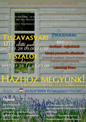 A Szabolcs-Szatmár-Bereg Megyei Rendőr-főkapitányság Bűnmegelőzési Osztályának munkatársai a „Házhoz megyünk!” prevenciós programmal 2017. november 28-án Tiszavasváriba és Tiszalökre látogatnak el. A szakemberek tájékoztatást és ajánlásokat adnak az érdeklődőknek vagyonvédelemről, az internet veszélyeiről, az áldozatvédelemről és a családon belüli erőszakról. Az országos kampánysorozat fő célja, hogy szakemberektől származó információk közreadásával a rendőrség segítse a közbiztonság növelését és javítsa az állampolgárok önvédelmi képességét. A megjelenteknek lehetőségük nyílik a „BikeSafe” program keretén belül kerékpárjaik ingyenes regisztrációjára.