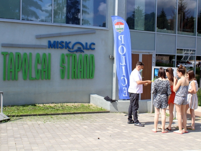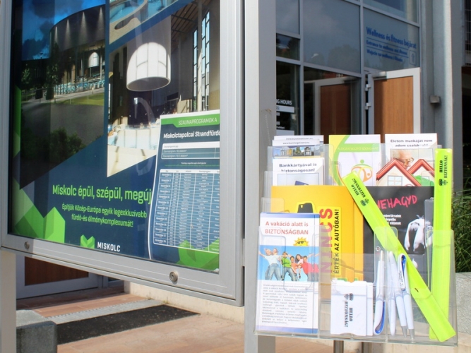 Az egyik miskolci fürdőkomplexum bejáratánál kaptak vagyonvédelmi, és biztonságtechnikai tanácsokat a pihenni vágyó fiatalok.