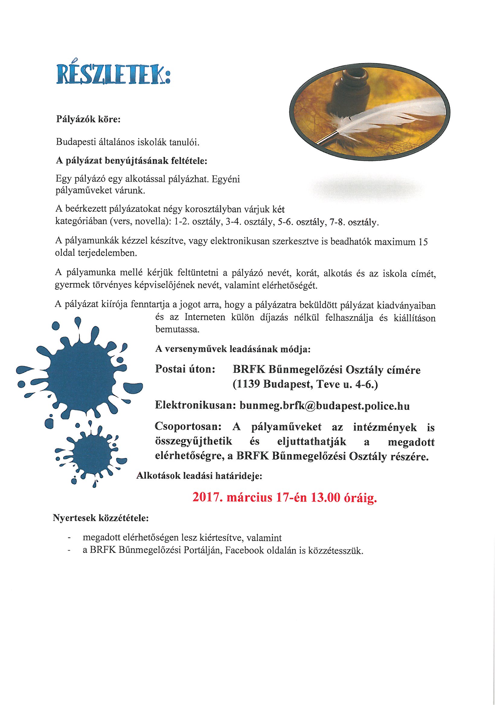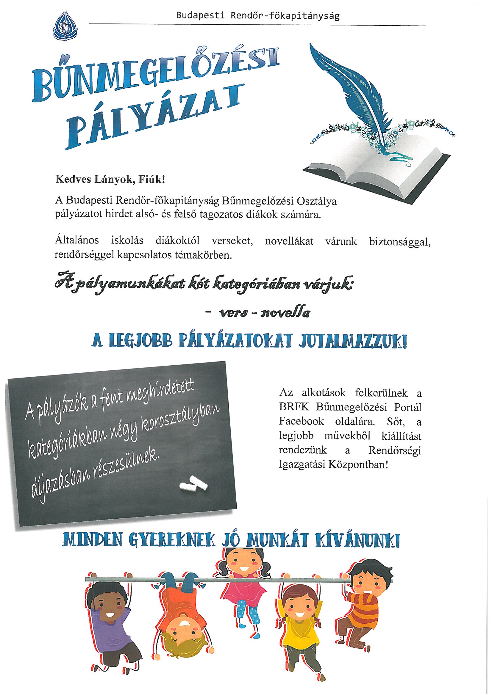 Költői vénával a biztonságért Megosztás A BRFK Bűnmegelőzési Osztálya bűnmegelőzési pályázatot hirdet általános iskolásoknak a „Magyar Kultúra és a Költészet Napja alkalmából”.
