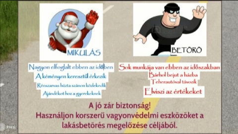 Kép és a szöveg egységével vezet a biztonságba a bűnmegelőzési szakemberek ajánlása az adventi időszakban. Érthetőek, rövidek és egyszerűek, mint a Mikulás és a betörő közötti különbség. A Mikluás ugye nagyon elfoglalt ebben az időben, a kéményen keresztül érkezik, rénszarvas húzta szánnal közlekedik. Ajándékot hoz a gyerekeknek, felnőtteknek! A betörőnek sok munkája van ebben az időszakban, bárhol bejut a házba, teherautóval távozik. Elviszi az értékeket!