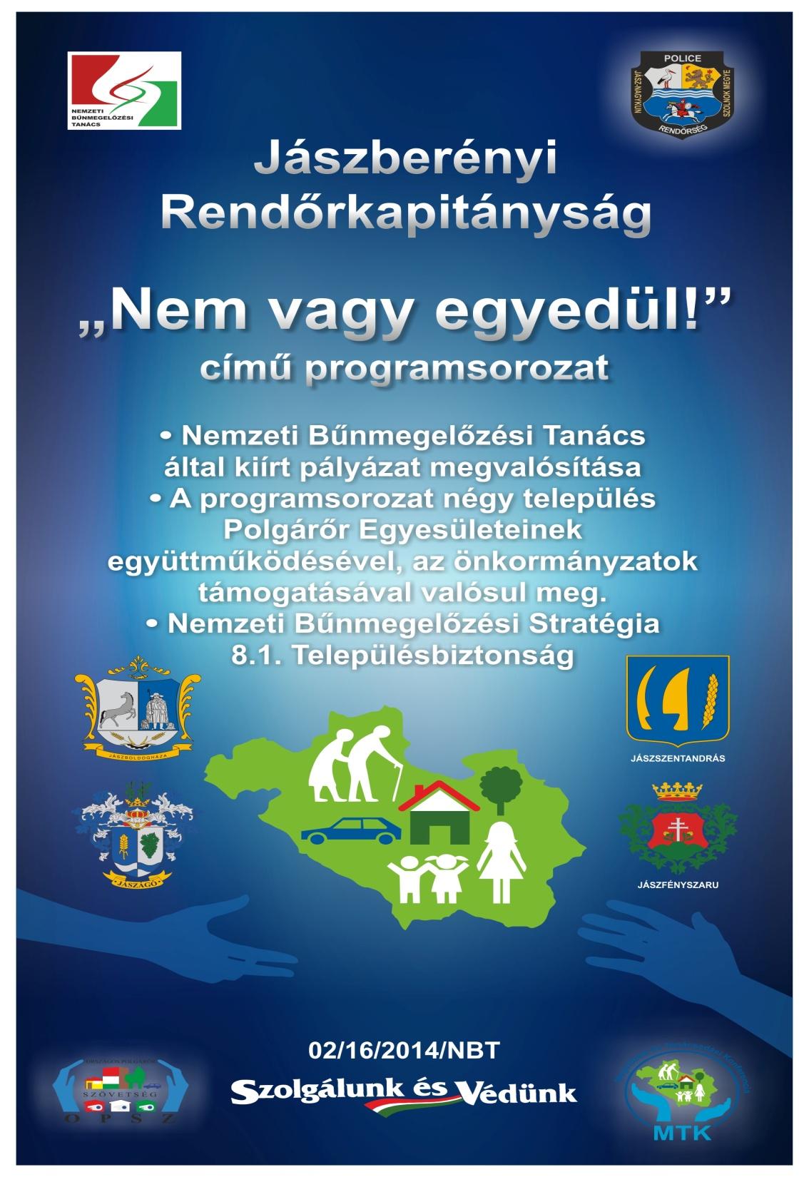 A Jászberényi Rendőrkapitányság a Jász-Nagykun-Szolnok Megyei Rendőr-főkapitányság segítségével „Nem vagy egyedül!” címmel 2015. április 9-én Jászberényben indította útjára új bűnmegelőzési programsorozatát.