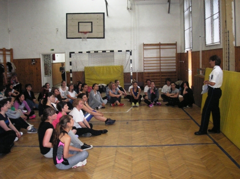 Császárné Elek Veronika rendőr alezredes megelőzési előadó a közbiztonságra különösen veszélyes eszközök, valamint a közterületen is magunknál tartható önvédelmi tárgyak körét mutatta be és felhívta a hölgyek figyelmét azokra az alapvető áldozatvédelmi szabályokra, praktikákra, amelyek szem előtt tartásával minimalizálható annak az esélye, hogy egy nő erőszakos támadás áldozatává váljon. A foglalkozás további részében a megjelentek néhány egyszerűbb önvédelmi fogást is kipróbálhattak. A gyakorlati oktatásba Kiss László rendőr törzszászlós és Pölöskei Miklós címzetes rendőr főtörzsőrmester is bekapcsolódott.