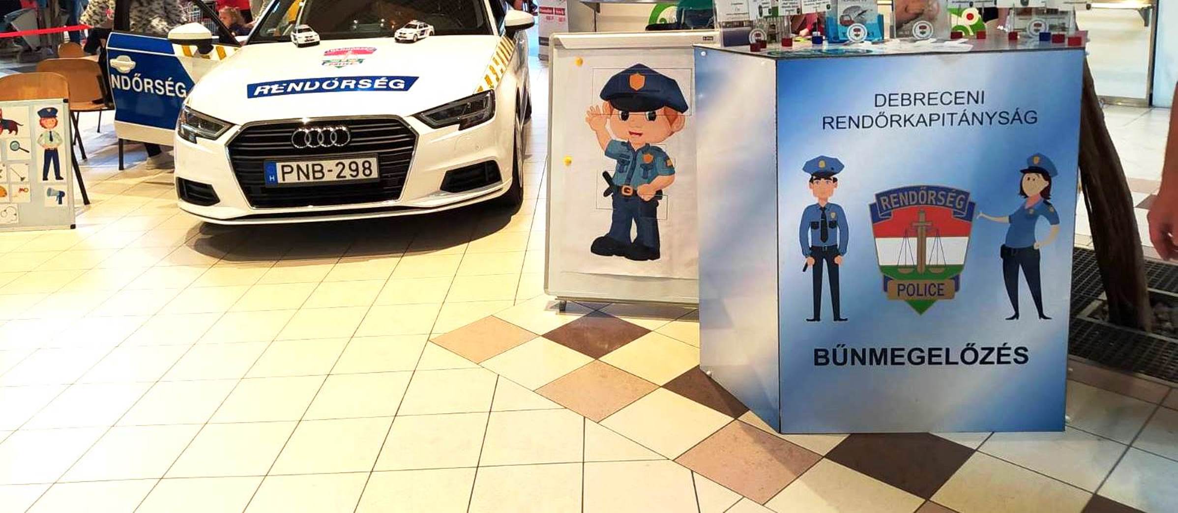 A Debreceni Rendőrkapitányság Bűnügyi Osztályának munkatársai ezúttal egy helyi bevásárlóközpont gyermeknapi rendezvényére látogattak el, ahol több száz embernek adtak hasznos prevenciós tanácsokat. A gyerekek megismerkedhettek az internet, a nyári szünidő veszélyeivel, emellett beülhettek a szolgálati autóba és megtekinthették a rendőrség szolgálati felszereléseit is. A jelenlévők hasznos bűnmegelőzési tanácsok mellett kipróbálhattak egy úgynevezett részeg szemüveget, majd különböző ajándékokat kaptak a rendőröktől.