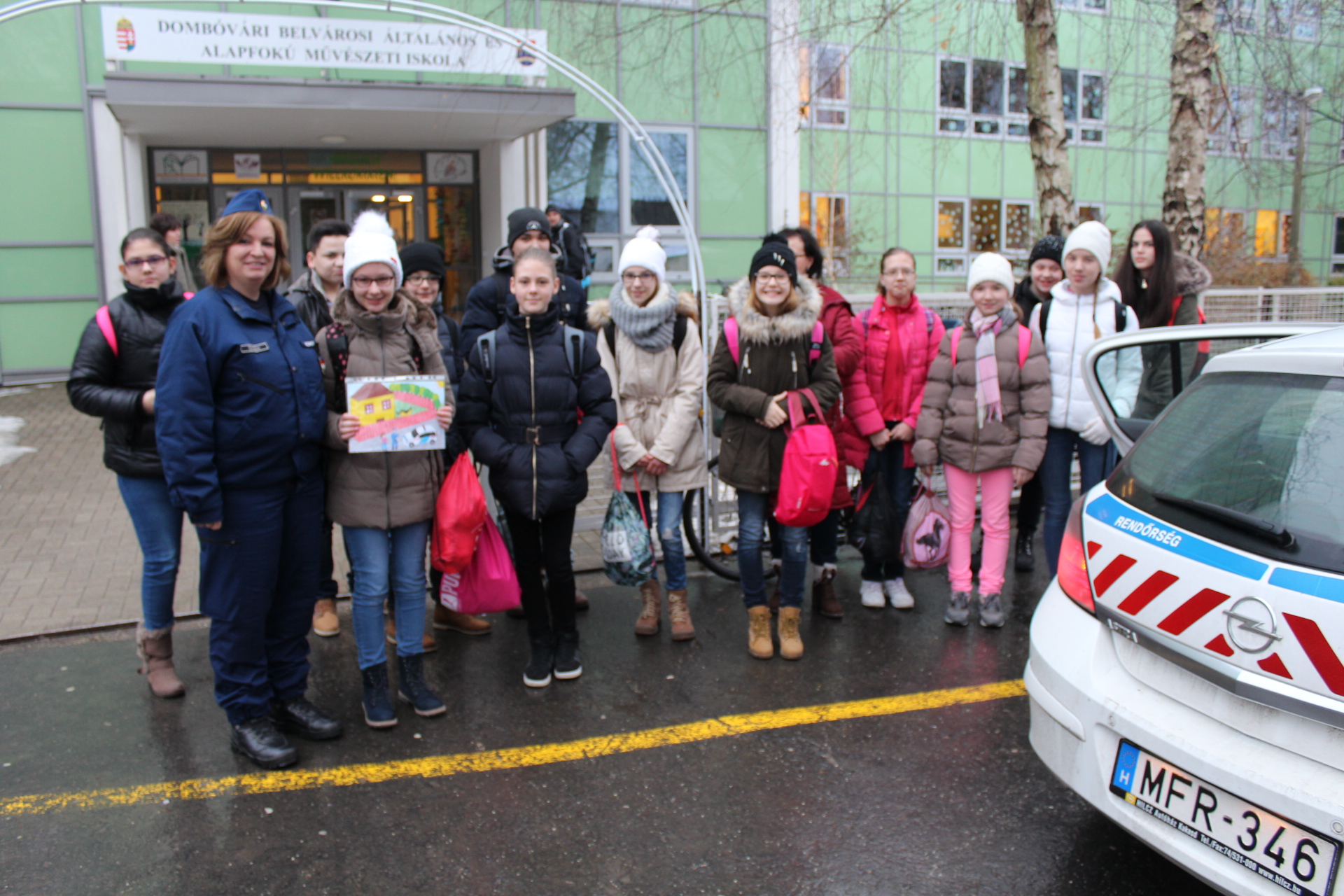 A diáklányt az iskola előtt osztályfőnöke és osztálytársai várták, akik beleülhettek és kipróbálhatták a Dombóvári Rendőrkapitányság szolgálati járművét.