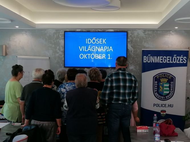 A rendőrök a közterületi munkájuk során napi kapcsolatban állnak az idősekkel, a megelőzést segítő rendezvényeken pedig rendszeresen tartanak előadásokat szépkorúaknak. A biztonságos internethasználat és a vagyonvédelem volt fókuszban 2022. szeptember 29-én és 30-án az egyik szarvasi hotelben, hiszen minden év október 1-je az idősek világnapja. A bűnmegelőzési szakemberek többek között felhívták a figyelmüket arra, hogy idegent ne engedjenek be a lakásukba! A kertkaput, lakásajtót akkor is zárják kulcsra, ha otthon tartózkodnak! Értékeit tartsák biztonságos helyen, ne hagyják szem előtt! Ha gyanús személy csenget be, ne nyissanak ajtót! Soha ne adjanak meg jelszót, PIN kódot e-mailben küldött kérésre! Online bankkártyás fizetésnél mindig győződjenek meg arról, hogy valódi banki oldalon adják meg az adatokat, más oldalon (pl. kereskedő oldalán) ne adják meg azokat! Senkinek ne adják meg a felhasználó nevüket és a hozzá tartozó jelszavukat!