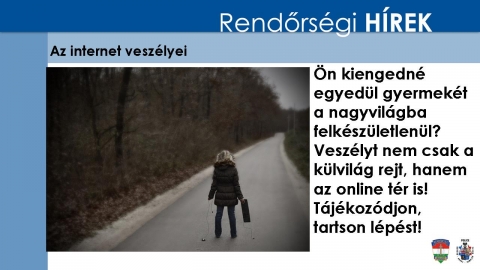 Az üzenetek a képek egységével válnak egyértelművé: „Ön kiengedné egyedül gyermekét a nagyvilágba felkészületlenül? Veszélyt nem csak a külvilág rejt, hanem az online tér is. Tájékozódjon, tartson lépést!”