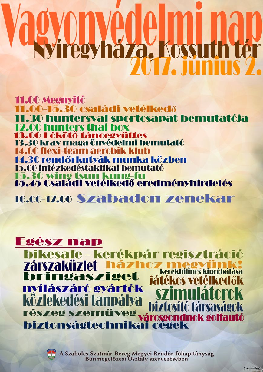 A Szabolcs-Szatmár-Bereg Megyei Rendőr-főkapitányság Bűnmegelőzési Osztálya 2017. június 2-án 11 órától 17 óráig a Nyíregyháza Megyei Jogú Város Önkormányzatával együttműködve vagyonvédelmi napot szervez Nyíregyháza Kossuth térre, ahol minden érdeklődőt szeretettel várnak. A rendezvény célja a lakosság figyelmének felhívása arra, hogy a vagyon elleni bűncselekmények jelentős része egy kis odafigyeléssel megelőzhető.