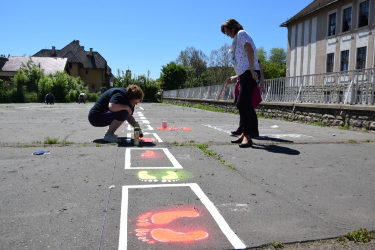 A rendőrök együttműködve a Salgótarjáni Egészségügyi- és Szociális Központ Családsegítő és Gyermekjóléti Központ munkatársaival fejlesztő játékokat festettek az iskola udvarára.
