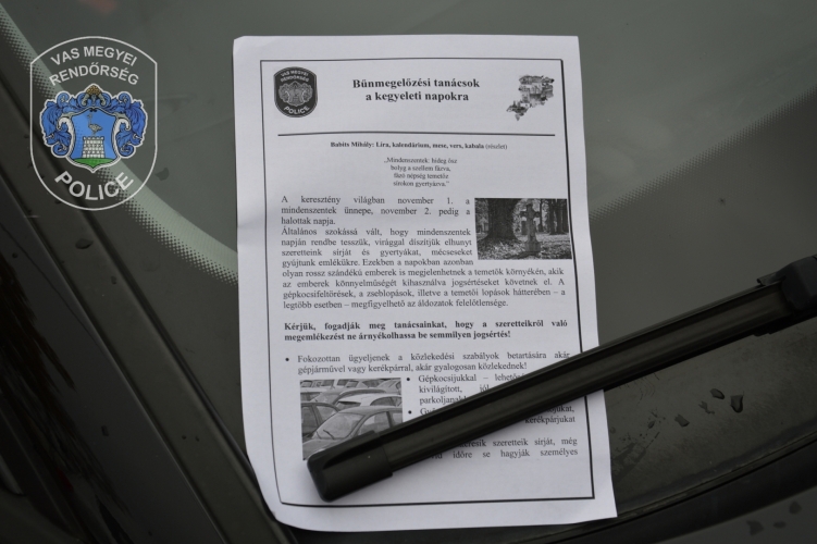 A Vas Megyei Rendőr-főkapitányság Bűnmegelőzési Alosztálya preventív bűnmegelőzési tanácsokat tartalmazó szórólapokkal hívja fel a figyelmet a vagyonvédelem fontosságára.
