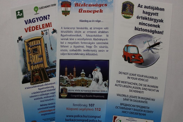 A Csongrád megyei rendőrök idén is több száz bűnmegelőzési szórólappal és karácsonyi kiadvánnyal hívják fel a figyelmet arra, hogy miként óvjuk értékeinket az adventi és karácsonyi időszakban is.