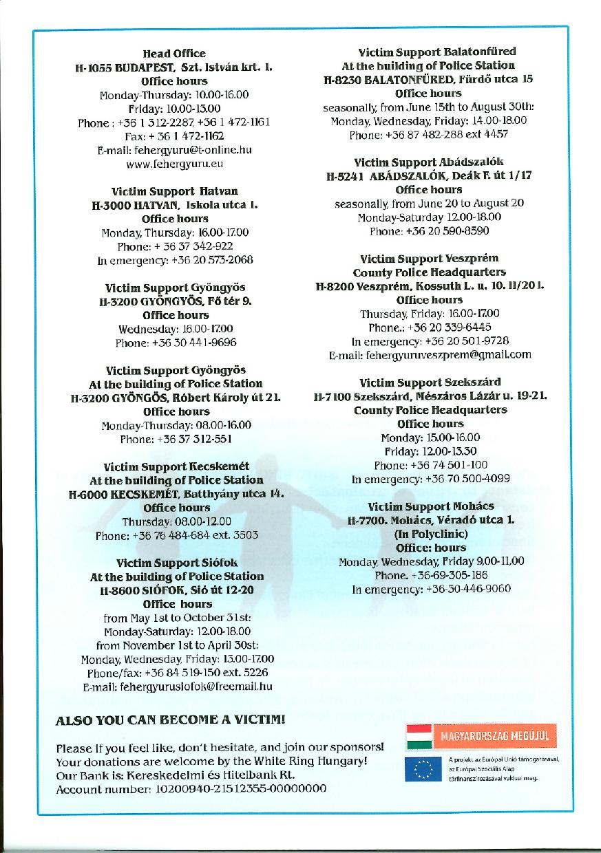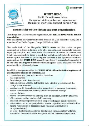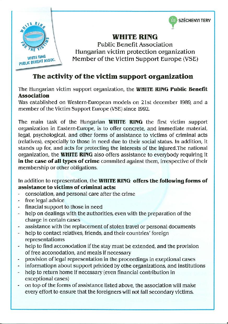 White Ring Public Benefit Association The activity of the victim support organization. << Vissza az előző oldalra Megosztás