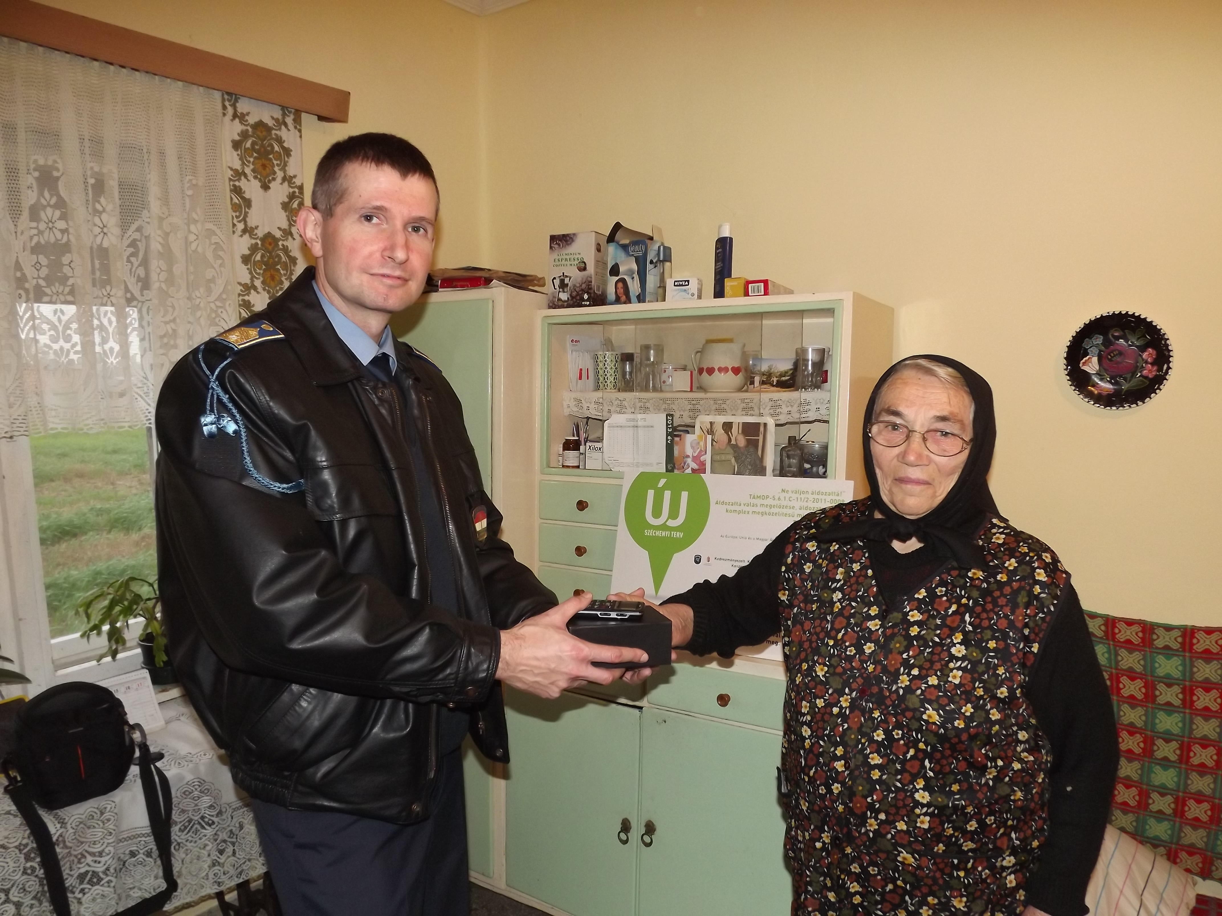 Egyedül él egy kis Tolna megyei faluban a 82 éves Hurtony Istvánné. A pörbölyi asszonynak adta át Tolna megyében a 200. rendőrségi segélyhívó mobiltelefont a Tolna Megyei Rendőr-főkapitányság (TMRFK) bűnmegelőzési alosztályának munkatársa, Király Balázs r. őrnagy, 2013. november 11-én.