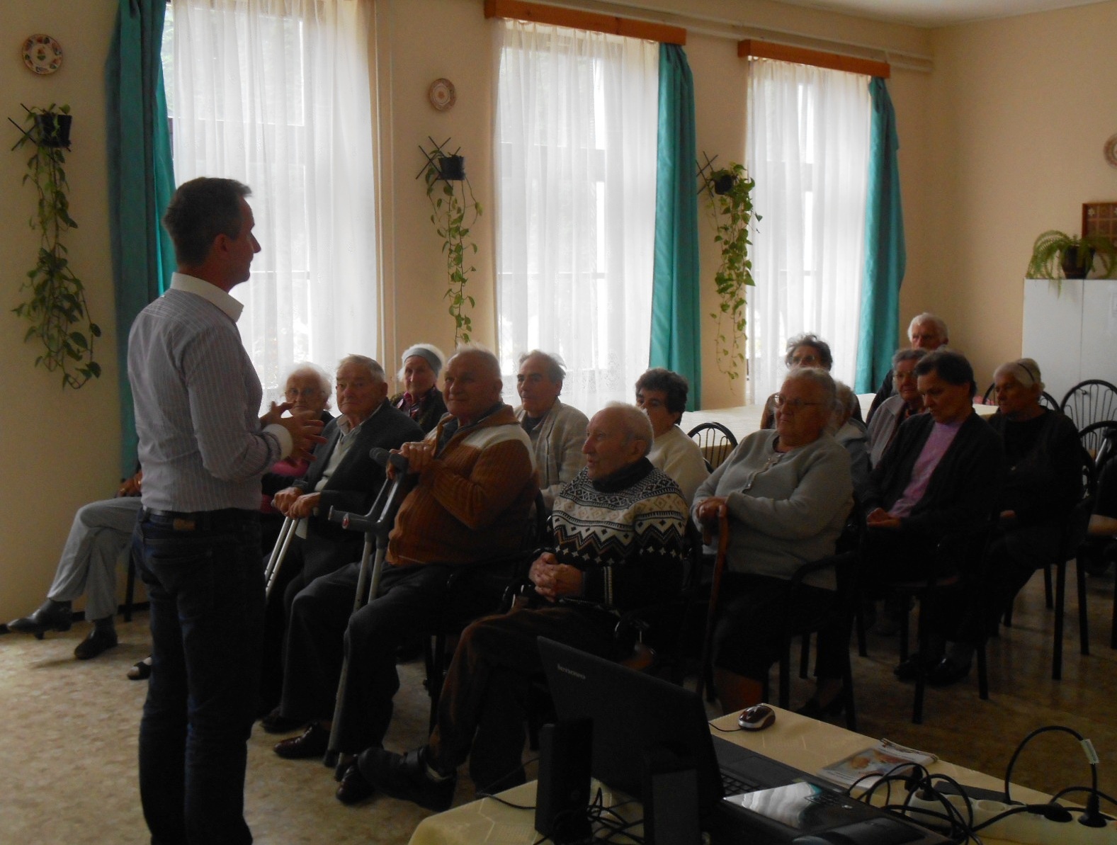Varga Sándor r. őrnagy úr a Csepreg Város Területi Gondozási Központban élő és napközben ott tartózkodó időseknek a „Biztonság a nap 24 órájában” címmel tartott vagyonvédelmi előadást 2015. szeptember 30-án. Munkatársunk megtörtént eseteken keresztül hívta fel a figyelmet azokra a problémákra, amelyekkel leginkább szembesül ez a korosztály. Gyakori, hogy különböző szolgáltatók munkatársainak adják ki magukat az idegenek, vagy éppen különböző történeteket találnak ki. Nevezetesen kórházi kezelés miatt van szükségük egy nagyobb összegre, csatornajavítás ürügyén kéredzkednek be, vagy telefonon a későbbi sértett unokáinak kiadva magukat csalnak ki tőlük készpénzt.