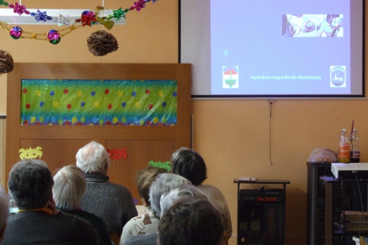 A Hajdú-Bihar Megyei Rendőr-főkapitányság munkatársa időseknek tartott bűnmegelőzési előadást Debrecen-Bánkon.