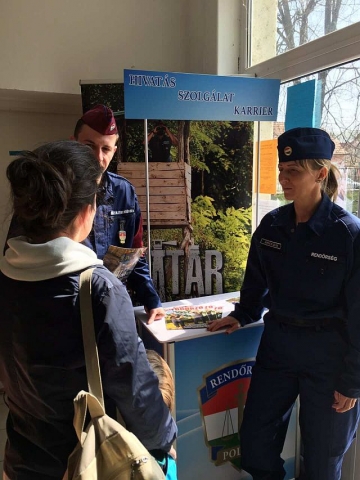 A rendőrök egy győri oktatási intézményben tartott egészségpiaci rendezvényen tájékoztatták a rendőri hivatás iránt érdeklődőket.